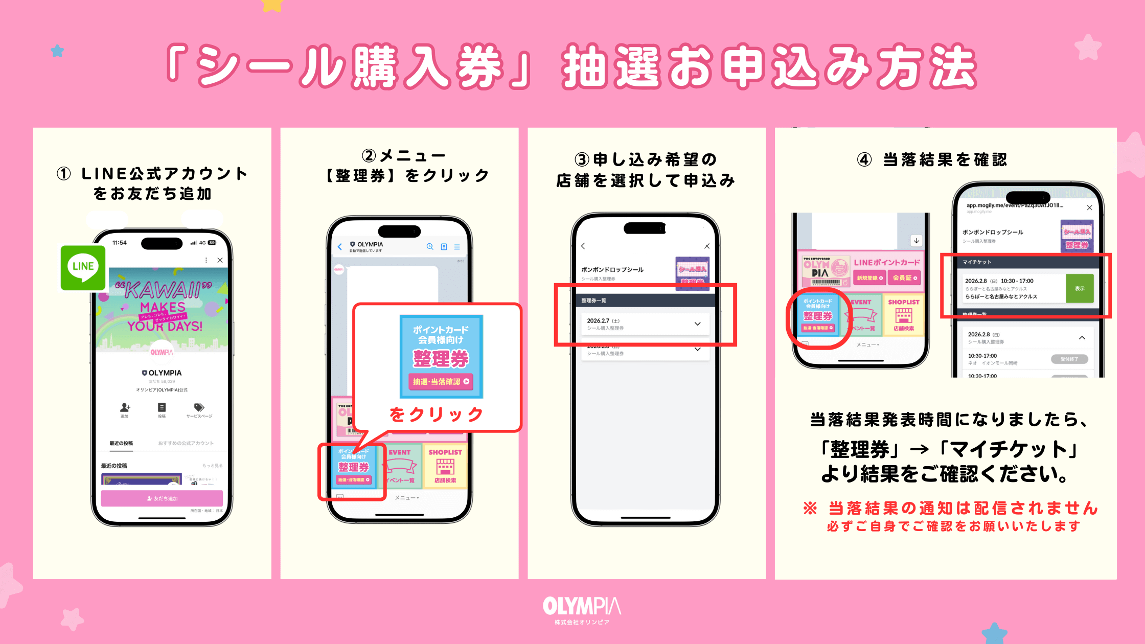・当日の整理券は、オリンピアLINE公式アカウントからお届けします。